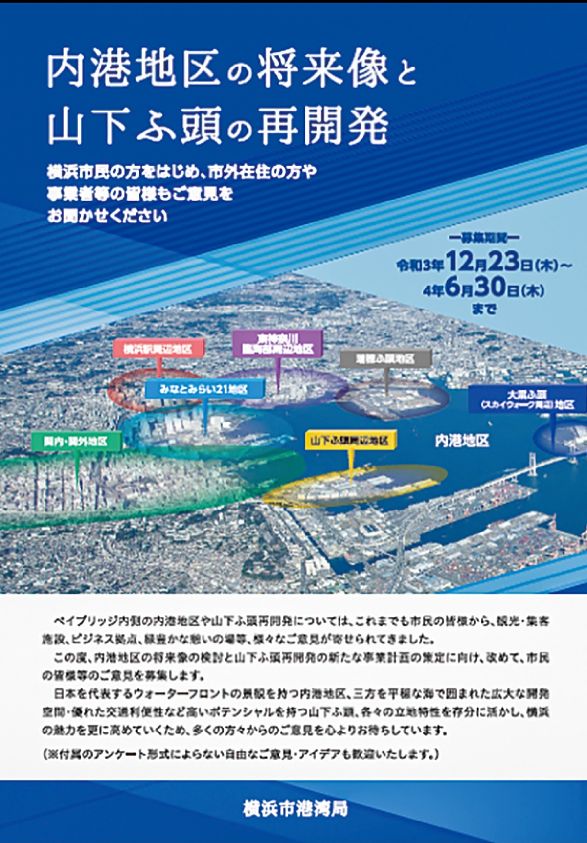 横浜市は、山下ふ頭再開発の新たな事業計画策定に向けて、市民から意見募集を開始した。合わせて横浜ベイブリッジから内側の内港地区の将来像の検討についても意見を募る。期間は今年の6月30日まで。
