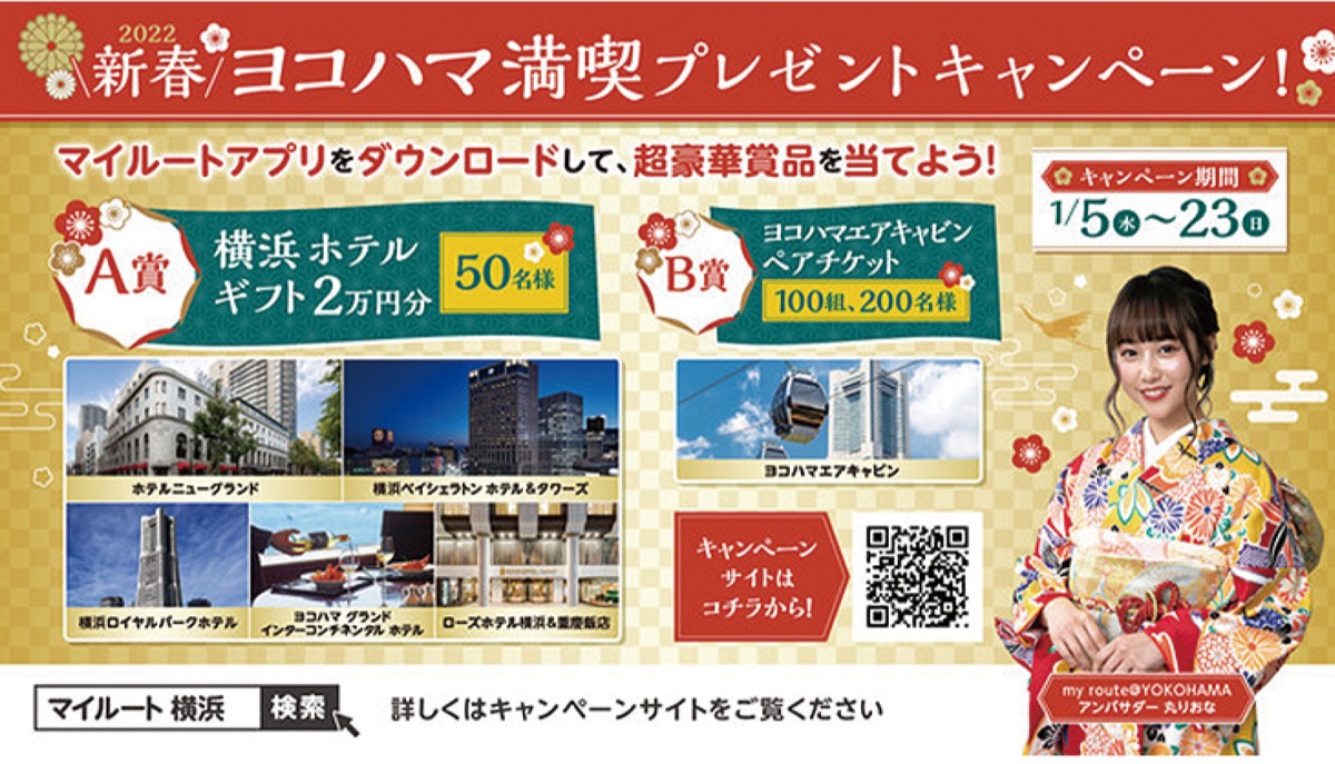 おでかけアプリ『my route(マイルート)』 を横浜エリアで展開する(株)アットヨコハマ=神奈川区=は1月23日(日)まで、横浜のホテルギフト券やロープウエー「ヨコハマエアキャビン」のペア券が抽選で当たるプレゼントキャンペーンを実施している。