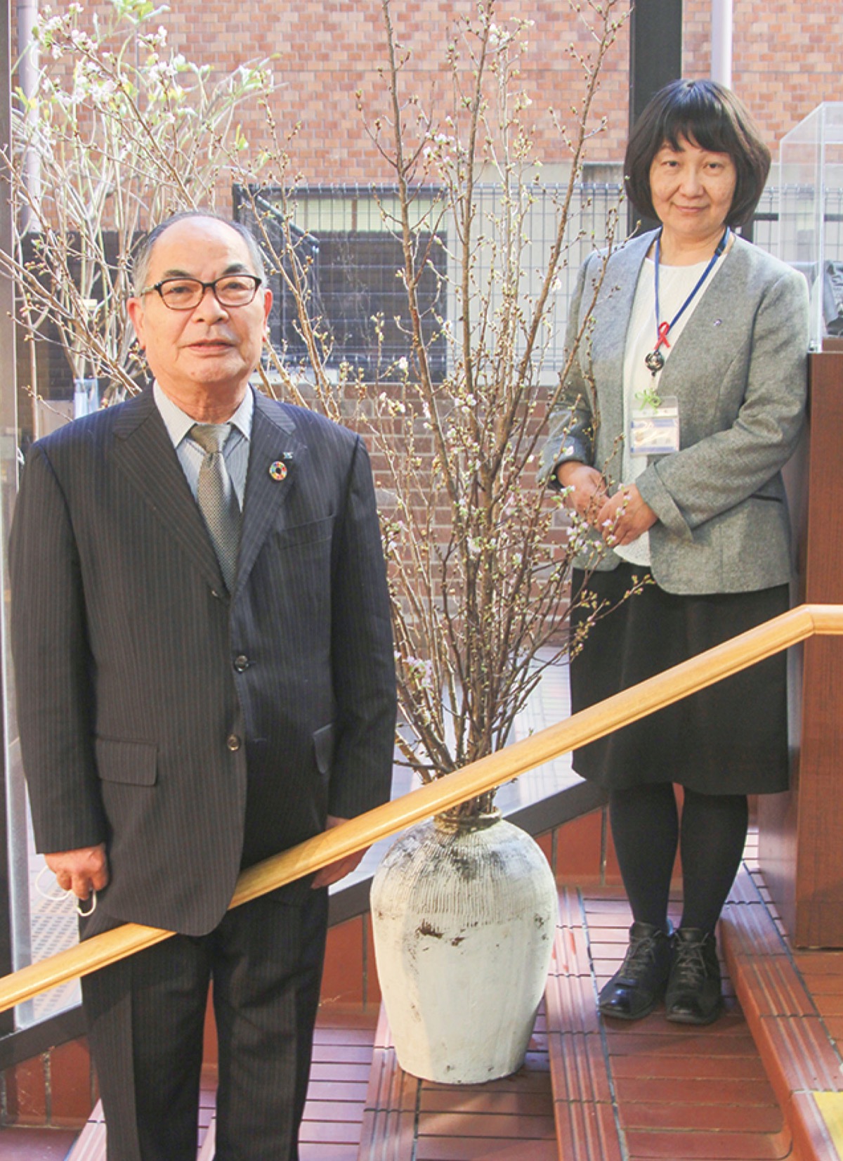 啓翁桜は山形県の名産品で、促成栽培で真冬に花を付け、正月行事などで飾られることが多い。米沢市から届いた約2mの枝を剪定し、区役所1階から2階の階段付近に展示した。