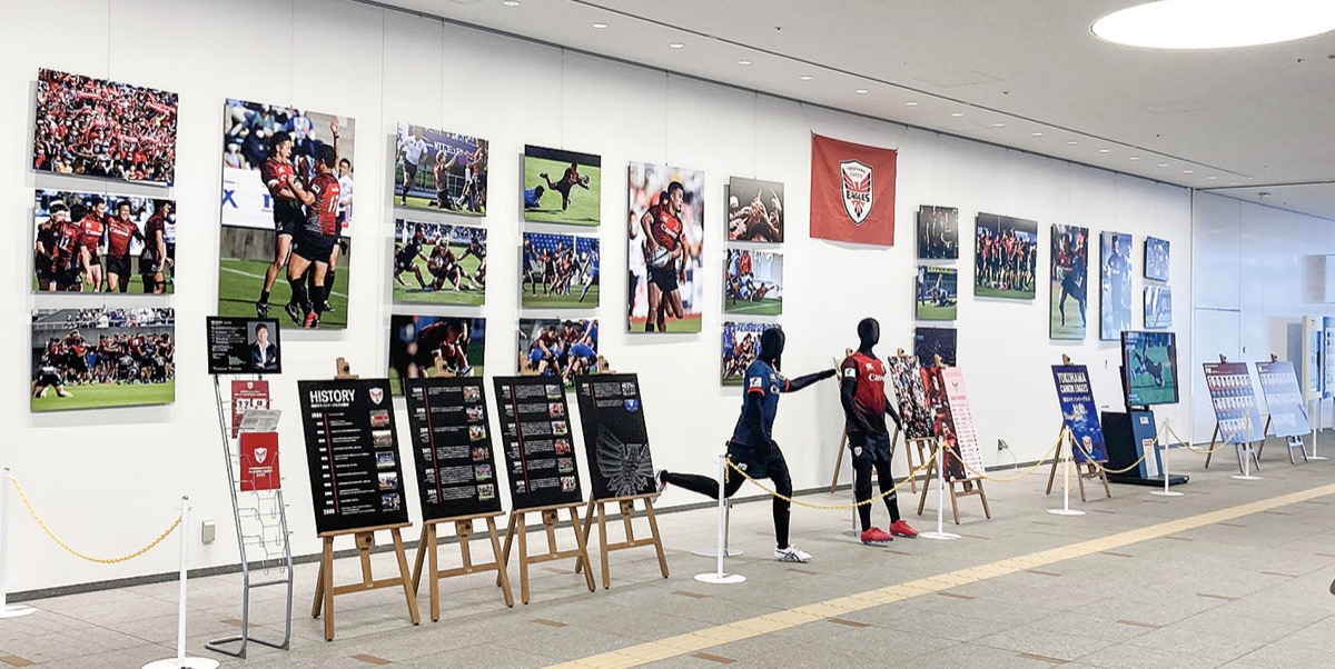 写真は同チームのオフィシャルフォトグラファーの水谷たかひと氏の作品で、昨年の「トップリーグ2021」の試合で撮影した迫力あるラグビーシーンや勝利の瞬間を観賞することができるほか、同チームの歴史の歩みをパネルで紹介。また、会場には新リーグで着用するチームカラーの「レッド」と横浜を想起させる「ブルー」のユニフォームの展示も行っている。
