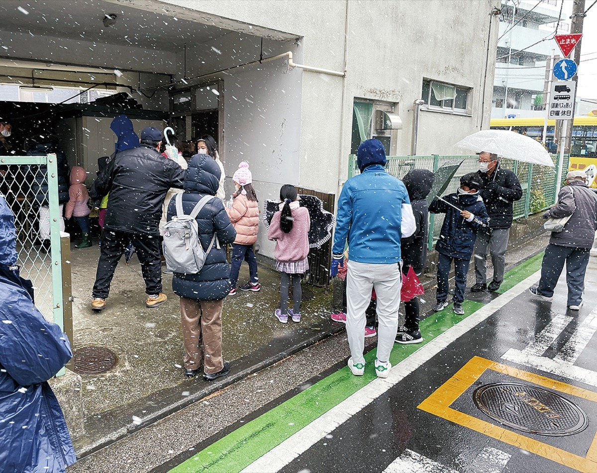 西区の第4地区会館で1月6日、手作り弁当を提供する「みんなの食堂」が実施された。雪が舞う中、子どもから高齢者までが列をなした。