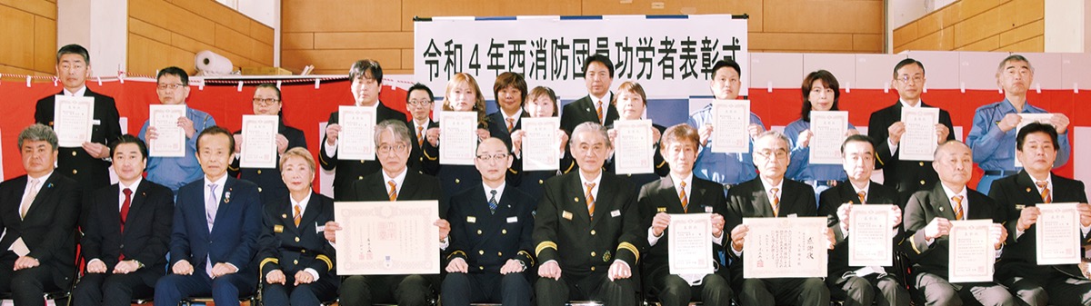 功労者は、県知事・市長・消防局長・消防団長の各表彰があり、式典では勤続30年、20年、10年、また優良団員の該当者の代表に、西川浩二署長と飯村勇一団長から感謝状が贈られた。
