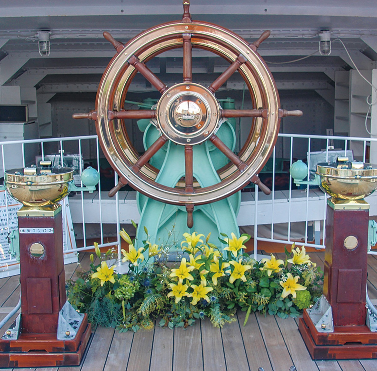 船尾にある舵輪や士官サロン、船長公室の3カ所にフラワースポットが設けられている。使用される草花は、同ホテル館内で利用した「ロスフラワー」を活用。花の廃棄削減へ繋がるSDGs(持続可能な開発目標)の取り組みの一環だ。ムサ・ジャパンがアレジメントを手掛けることで、1週間ごとに異なる草花が楽しめる。1月14日には、ユリやストレクチアなどが装花されていた。