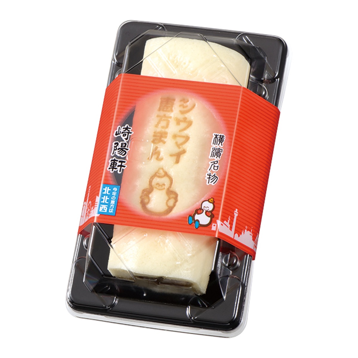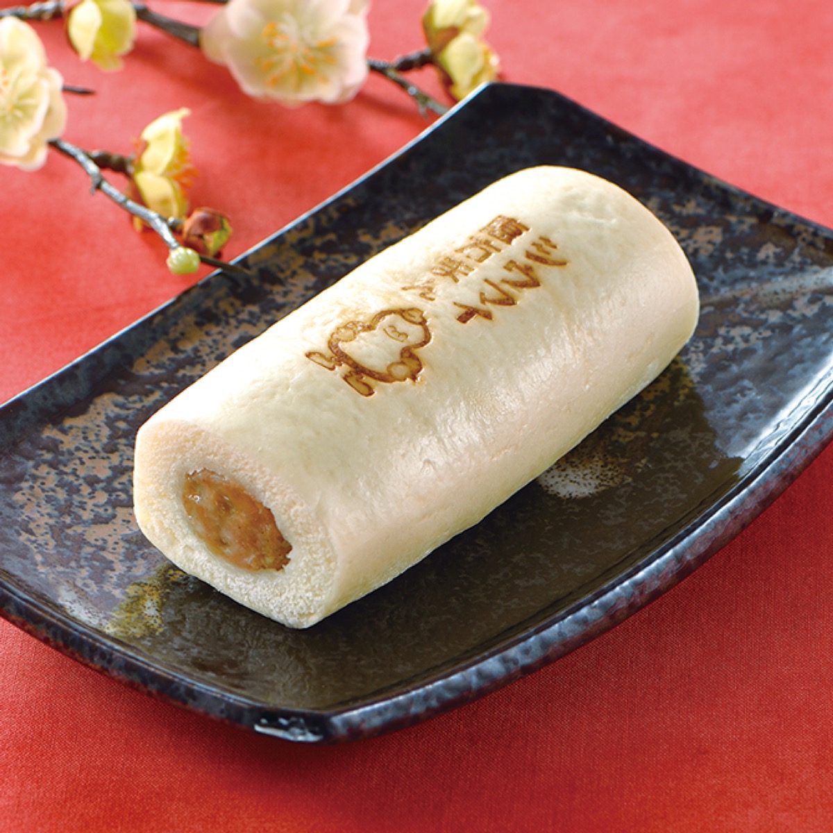 シウマイのあんを中華まんの皮で巻き、ロール状に仕上げたシウマイの崎陽軒ならではの恵方巻き。長さ約10cm、直径約4cmと、一般的な恵方巻きよりも小ぶりサイズで、人気のしょう油入れのキャラクター「ひょうちゃん」の焼印を押し、「福を巻き込む」ように、一本一本丁寧に仕上げた商品だという。