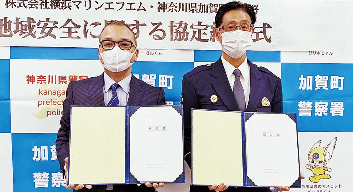 加賀町警察署(上原正署長)は1月28日、コミュニティラジオ「マリンFM」の放送を行う(株)横浜マリンエフエム(笹原延介代表取締役)=中区本牧町=と「地域安全協定」を結んだ。同署から犯罪被害防止や事故防止などに係る情報提供を行い、同社の番組などで周知を行う。