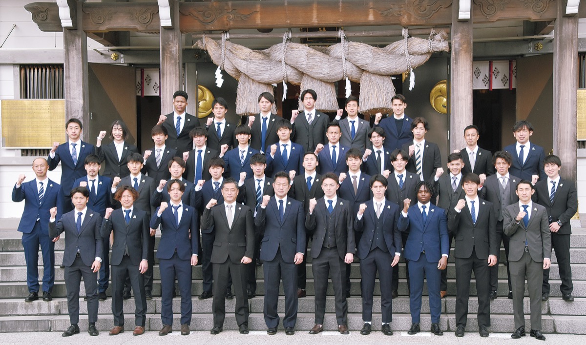 プロサッカーリーグJ3に所属する「YSCC横浜」が1月26日、本拠地である中区本牧の鎮守・本牧神社で必勝祈願を行った=写真。