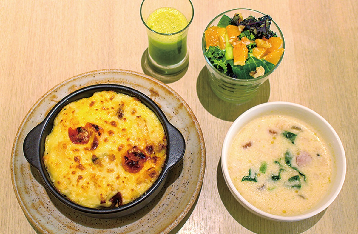 1日から提供されている同定食は、西区のレストラン「ミクニヨコハマ」のシェフとコラボレーションしたシーフードドリアに、みなとみらいの資生堂の研究所内にあるカフェ「S/PARKCafe」と共に、サラダ、チャウダー、小松菜スムージーを考案。