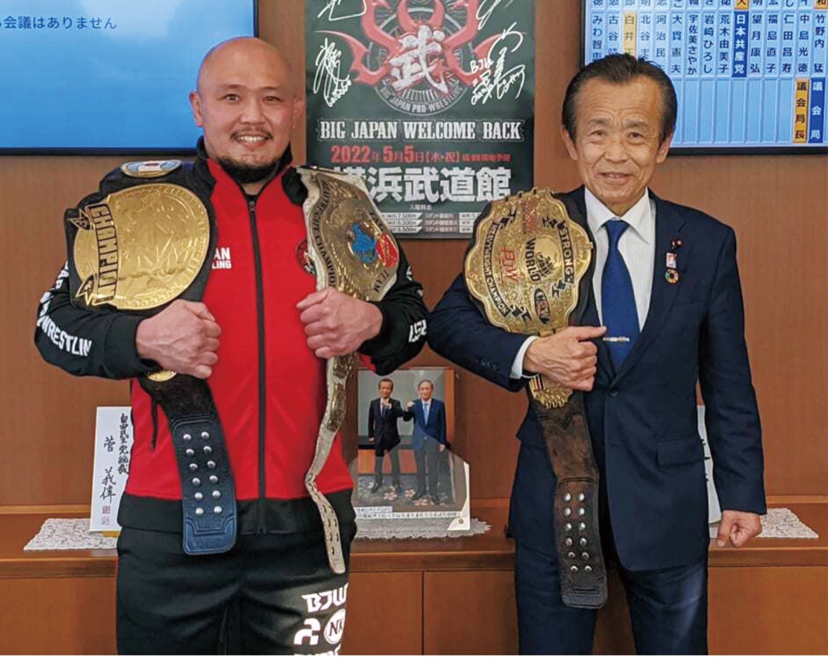 プロレス団体「大日本プロレス」の岡林裕二選手が1月26日、横浜市会の清水富雄議長を訪れ、同団体が5月5日に横浜武道館=中区翁町=で行う大会をアピールするなどした。