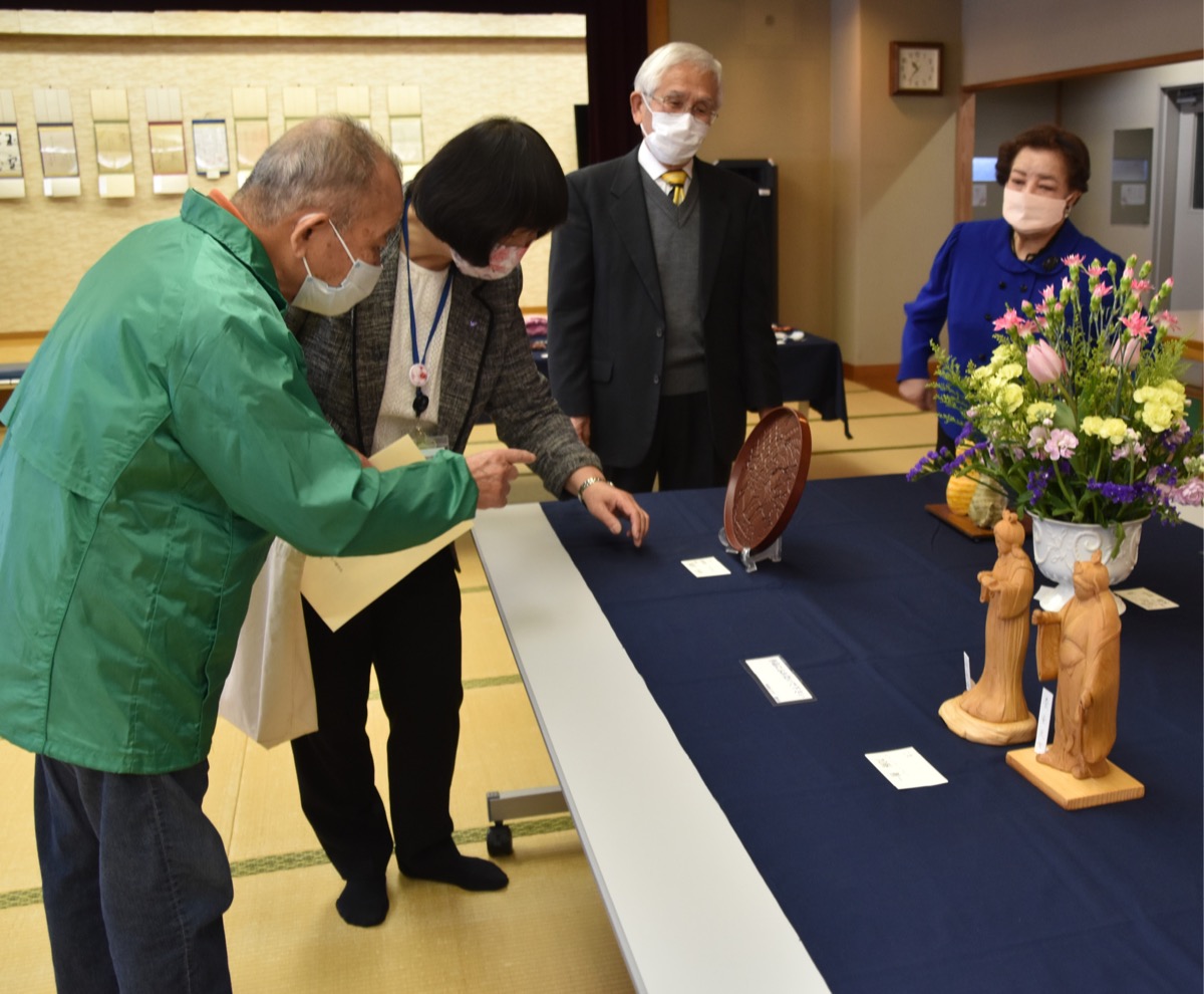 会場には手芸や絵画、書道、俳句・短歌、写真、工芸・彫刻など、各クラブの会員が丹精込めて作った作品が約100組並んだ。中区寺久保在住の服部光伸さん(78)は、半年ほどかけてあじさいの図柄を彫り込んだ鎌倉彫のお盆を制作した。鎌倉彫をはじめて約3年といい、他のメンバーからは「筋がいい」と褒められていた。