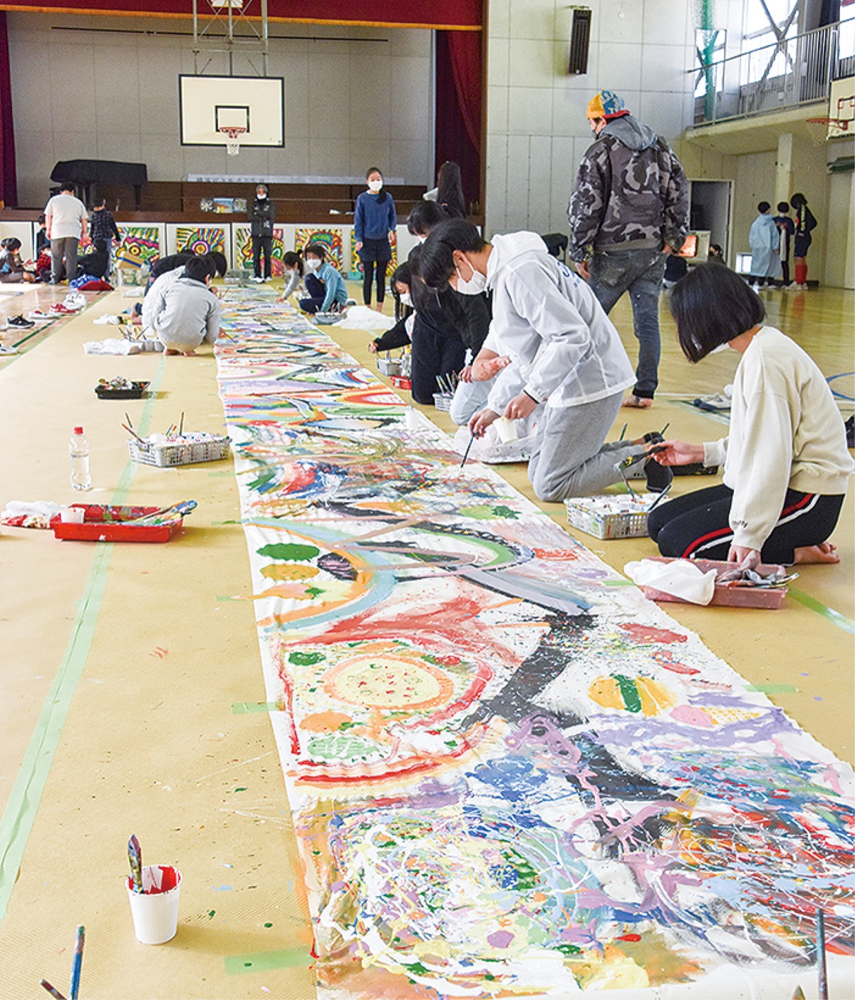 2月16日には、中区在住のアーティスト、ロコ・サトシさんが6年3組の38人に絵の手ほどき。幅約1mの白布を体育館に約22mにわたり敷き、「虹のメッセージ」をテーマに児童らが思い思いに絵を描いた。