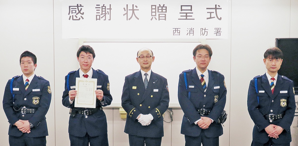 スカイビル警備隊は、昨年11月に発生した心肺停止状態の男性に対して的確で迅速な応急措置を行い人命救助に貢献したとして、西消防署(西川浩二署長)から感謝状が贈られた。2月21日には横浜スカイビルで贈呈式が行われ、佐々木優隊長をはじめ警備隊の4人が出席した。