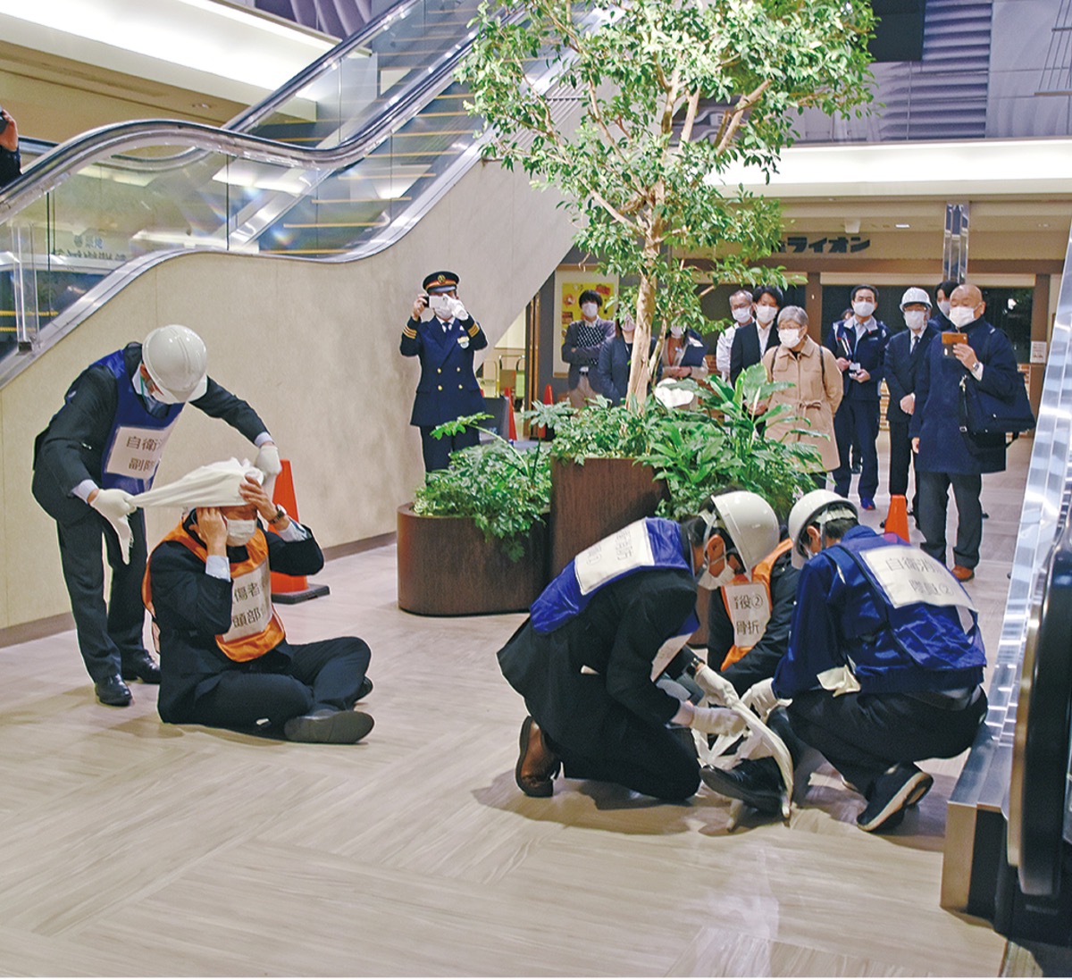 各テナントのスタッフからなる自衛消防隊やジョイナスおよびJRタワーの警備員をはじめ、西消防署の消防隊員ら、総勢約60人が参加。コロナの影響で2年間中止となっていたため、実際の訓練は3年ぶりとなる。
