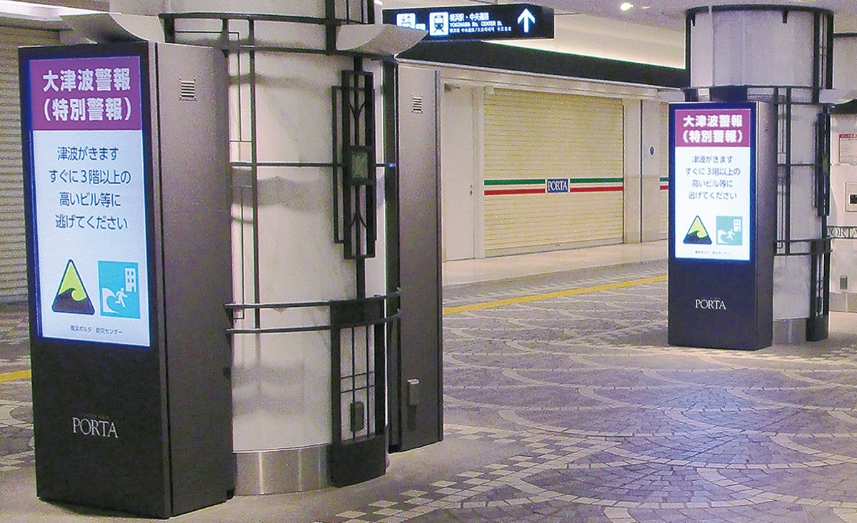 横浜駅東口の地下街ポルタ館内に3月1日からデジタルサイネージ(電子看板)が導入されている。同館を運営する横浜新都市センター(株)(小谷昌取締役社長)=西区高島=が設置したもので、地震や津波など災害発生時の情報発信などを強化する。