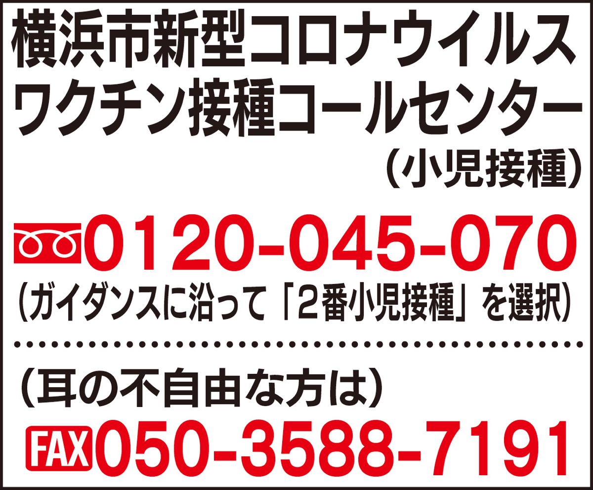 市では、ワクチン接種に関する正確な情報提供や相談体制の充実などに取り組むとともに、周りの方に接種するか否かを強制したり、接種に関して差別的な対応が起こらないような広報に努めます。そして、子どもたちの感染拡大のリスクを抑えるともに重症化を防ぐことができればと思います。ワクチン接種について疑問や不安がある場合には、日頃から受診しているかかりつけ医などに相談されるか、左記の横浜市新型コロナウイルスワクチン接種コールセンター(小児接種)にお問い合わせください。