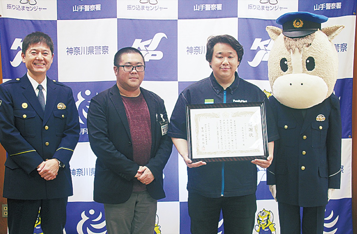 山手警察署(椎名啓之署長)は3月3日、特殊詐欺被害を未然に防止したとして、ファミリーマート本牧大里町店(竹野亮店長)に感謝状を贈呈した。