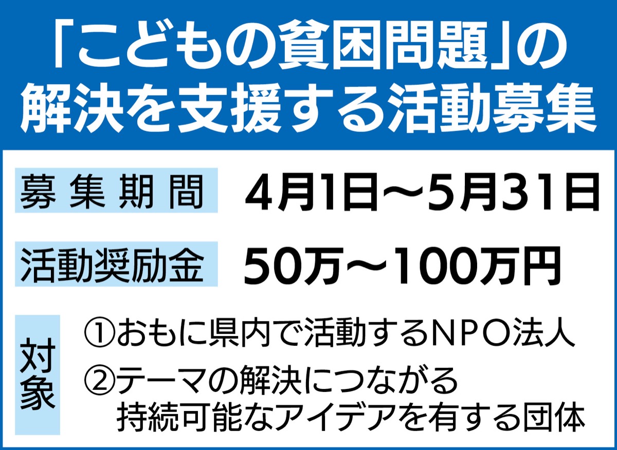 第1回目は「こどもの貧困問題」の解決に向けた取り組みについて、4月1日(金)から5月31日(火)まで募集している。おもに神奈川県内で活動し、子どもの貧困問題解決につながる持続可能な活動アイデアを有するNPO法人が対象。書類審査などを実施し、合計3件ほどを選考する予定だ。活動奨励金は1件あたり50万円〜100万円を支給する。選考結果の発表は9月頃を予定している。