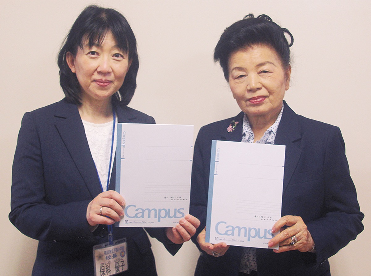 保科校長は「子どもたちの励みになる言葉を添えたノートを寄贈いただきありがとうございます」と同連合会に感謝を伝えた。