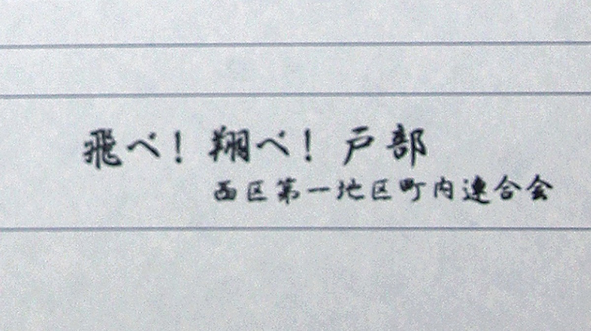 ノートの寄贈は「子どもたちに地域を忘れず、キズナで繋がっていたい」という最後のアイデア。ノートには学校の合言葉である「飛べ!翔べ!戸部」の文字と同連合会の名前が記されており、粕川会長は「このノートが子どもたちの励みになり、地域とのキズナを確かめるものになれば」と寄贈の思いを言葉にする。