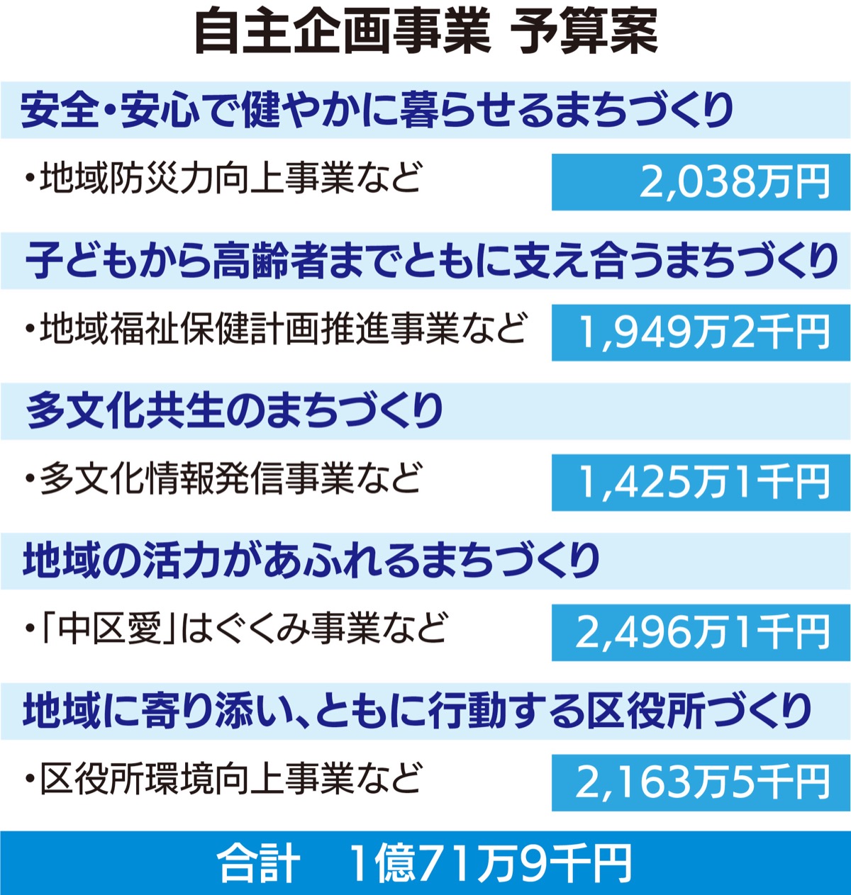 中区の自主企画事業費は、昨年度同様の約1億円。新型コロナウイルス感染拡大以降、個人・団体の活動が大きく制限されるなかで、新たに「『中区愛』はぐくみ事業」を創設したほか、インクルーシブスポーツ推進事業も昨年度より大きく拡充し、多文化交流事業の発信とともに、共生社会の実現を目指していく。