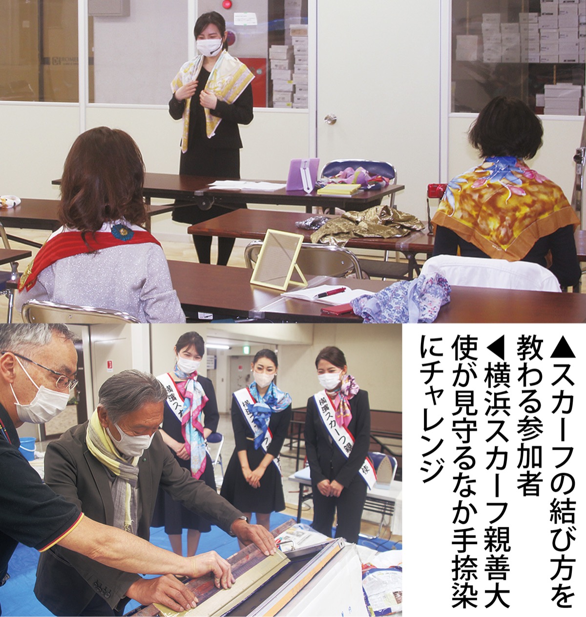 同イベントは、シルクセンターを会場に横浜スカーフなどのシルク製品にまつわる様々な商品の販売やワークショップを展開した。スカーフの結び方教室では、スカーフの大きさに合わせて様々なアレジメント方法を指導。参加者は、持参したスカーフで講師と一緒に結び方を学んでいた。また、横浜スカーフを製造する工程では欠かせない手捺染(てなっせん)(ハンドプリント)の体験も専門家のアドバイスのもと行われた。