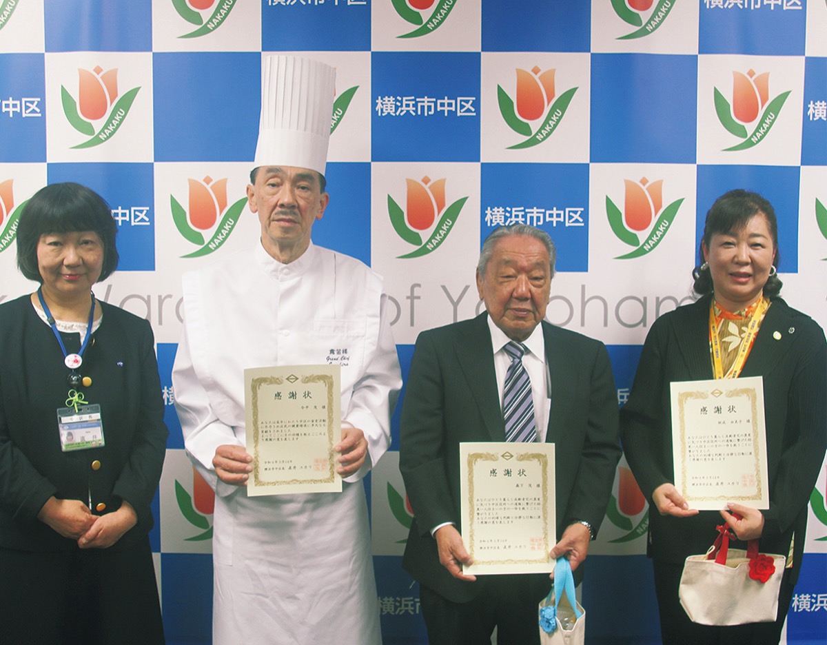 地域活動などに積極的に取り組み、活力ある中区の実現に貢献した個人や団体を顕彰する式典が3月14日、中区役所で行われた。今年度の受賞者は(株)鈴音横濱元町霧笛楼の統括総料理長で取締役の今平茂さん、赤英町内会長の森下茂さん、第一北部地区民生委員の秋成由美子さんの計3者。直井ユカリ中区長が感謝状を手渡した。