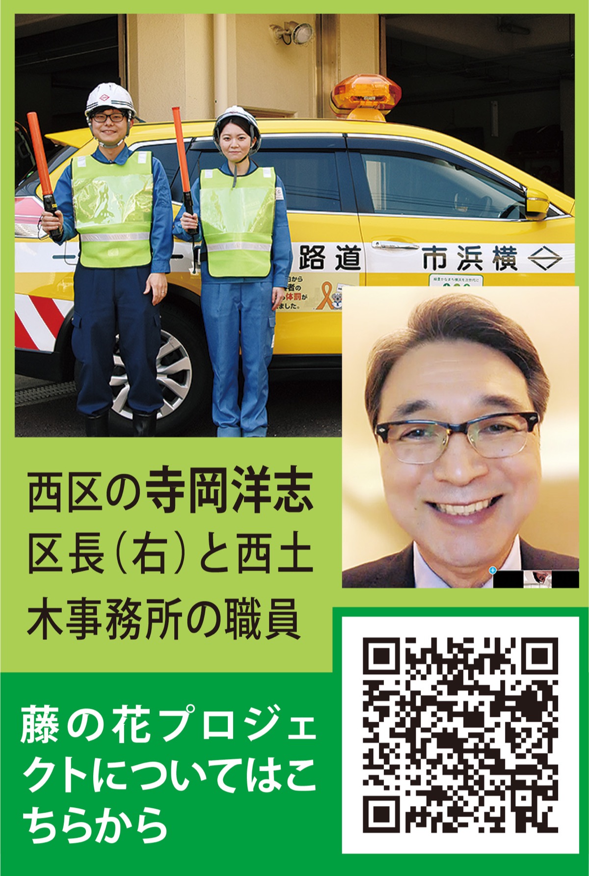 地域の皆様や地元企業との協働も重要な業務です。道路の清掃や美化活動などを行うハマロード・サポーターや、公園の清掃活動などを行う公園愛護会を支援しています。藤の花再生プロジェクトは西区ならではで、少しずつ藤の花が増えることを期待しています。