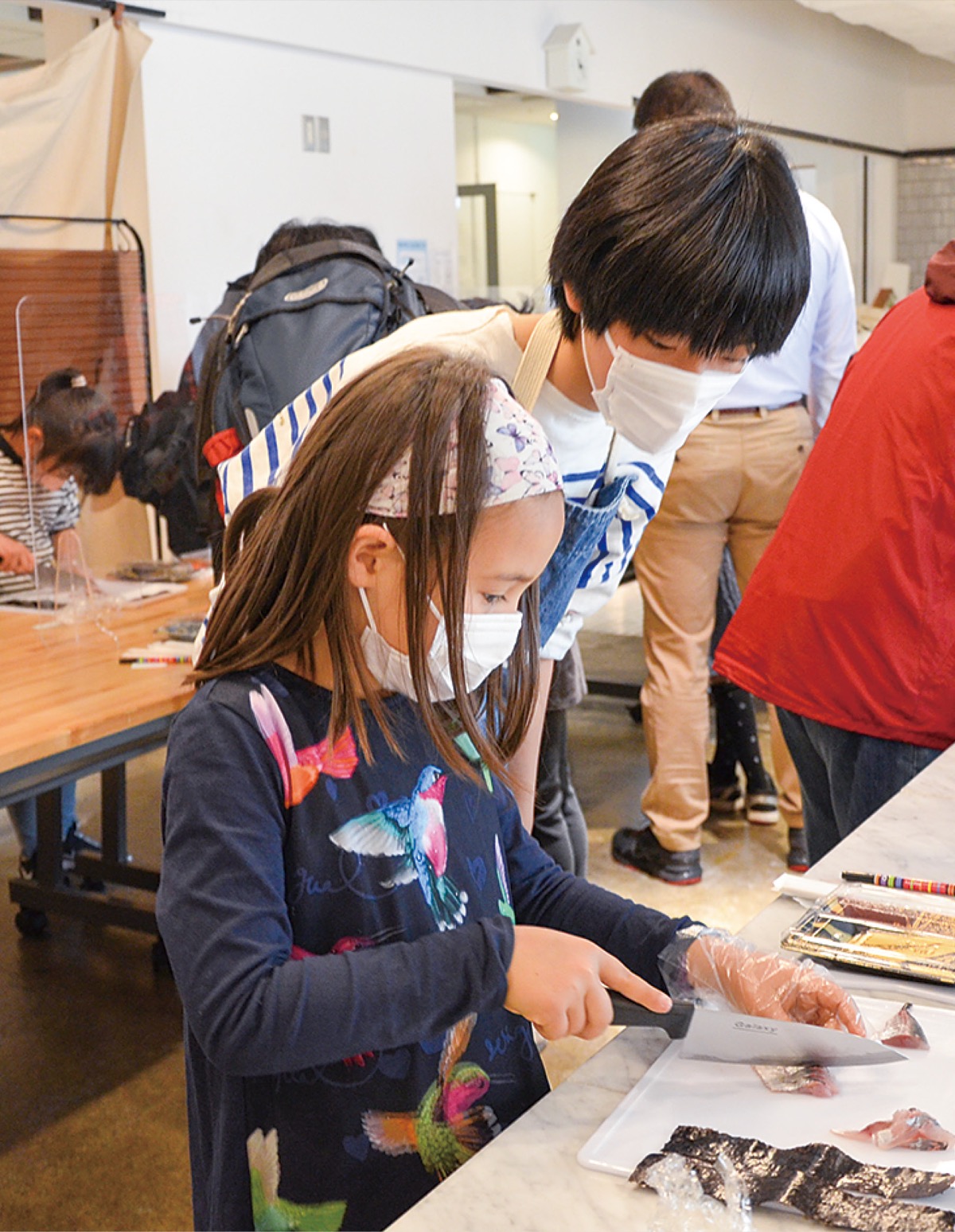 また会場近くのオープンキッチンでは「おさかな教室」も開催。おさかなコーディネーターのながさき一生(いっき)さんと、最年少野菜ソムリエプロで日本さかな検定1級を持つ中学生・緒方湊さん=青葉区在住=が講師となり、抽選で選ばれた親子が参加した。すしネタのアジは、2人が当日の朝早く中央市場で仕入れたといい「アジフライはソースだけでなく醤油もおすすめ。サクサクの食感が残って美味しいですよ」緒方さん。魚の説明や美味しい食べ方などを伝授した。デモンストレーションの後、子どもたちは包丁を持って刺身を切り、にぎりずしを作った。