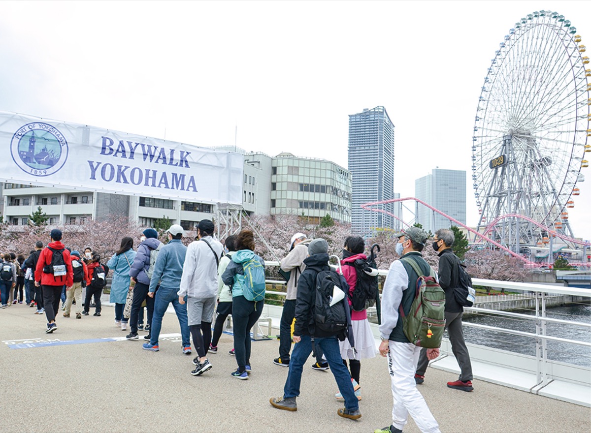 イベントは、ヨコハマグランドインターコンチネンタルホテル付近の女神橋の開通、距離表示や観光情報などをまとめた地図にアクセスする二次元コードをコースの路面に表示したことなどを記念して行われた。参加者は神奈川大学駅伝チームの選手、ミス日本「海の日」に輝いた属(さっか)安紀奈さんとともに女神橋から大さん橋までの3・5Kmを歩いた。