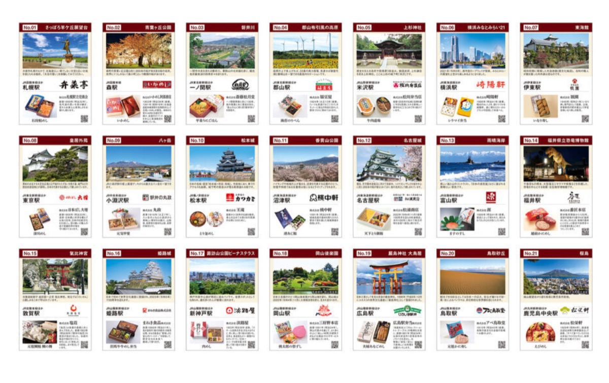 これは崎陽軒の野並直文社長が会長を務める(一社)日本鉄道構内営業中央会所属の駅弁業者21社が、「駅弁の日」※(4月10日)にあわせて、オリジナルの「おにぎり駅弁」を販売する企画。各社おすすめの観光名所を紹介した駅弁カードも添えられている。