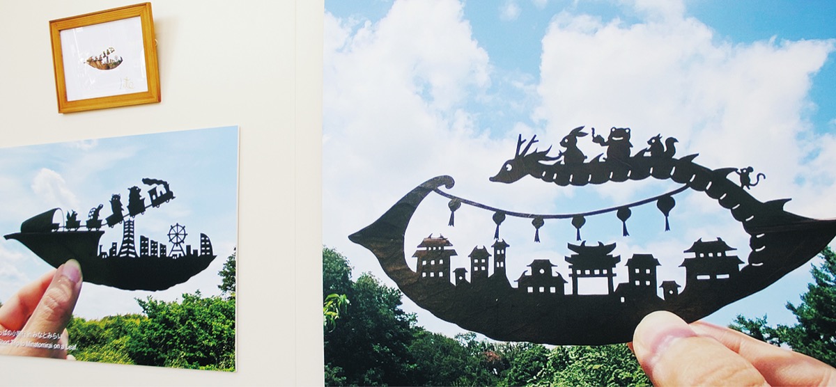 同イベントのために制作された初公開作品『春風に乗ってどこまでも』をはじめ、中華街やみなとみらいといった横浜をモチーフにした作品=写真=など全12点を展示。SNSで発表した写真と現物の葉っぱ切り絵をあわせて見ることができる。会場では制作風景の紹介動画が見られるほか、著書やポストカードなどのオリジナルグッズも販売されている。