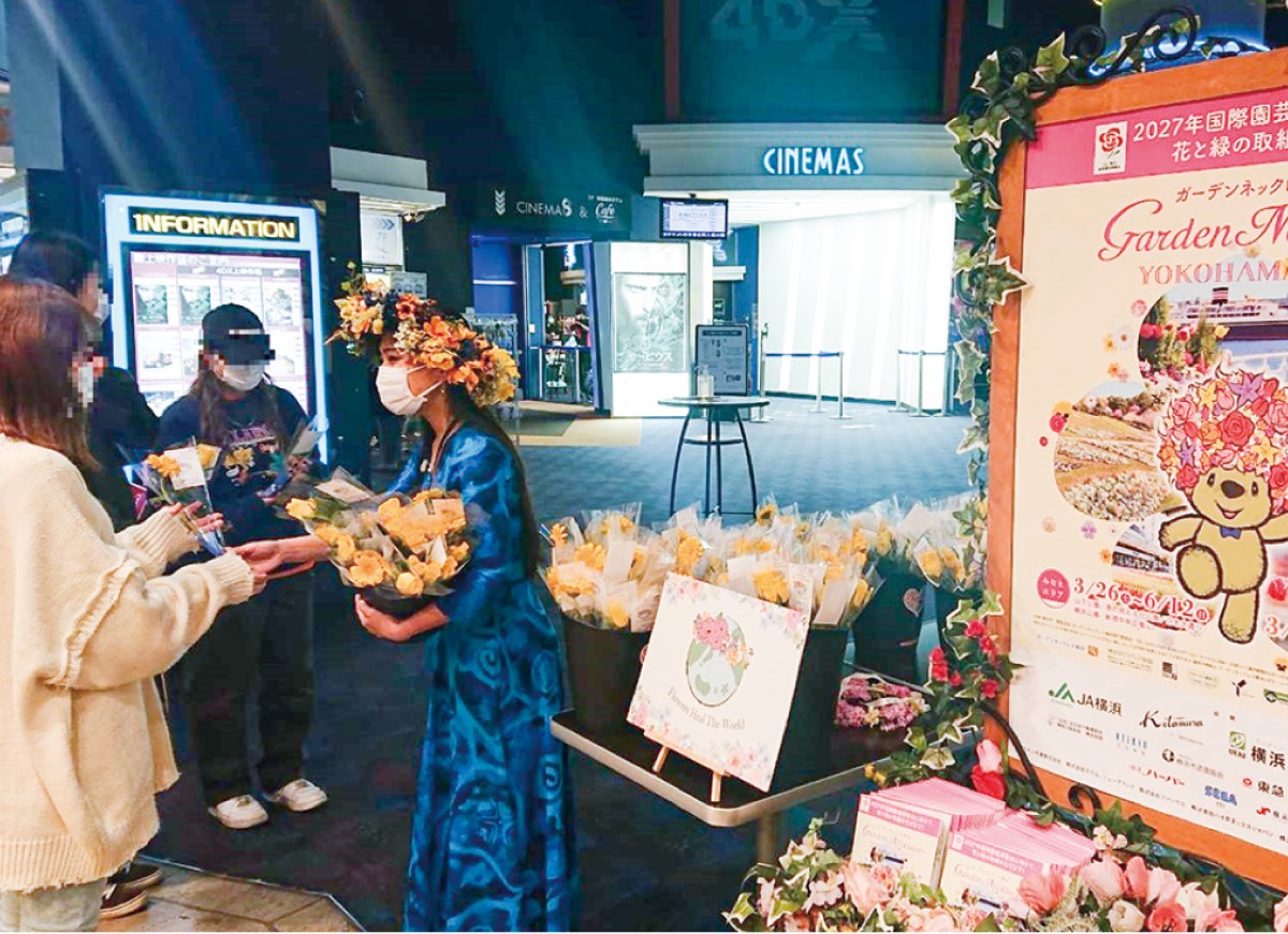 イオンシネマみなとみらいで4月2日、来場者先着500人に花がプレゼントされた。