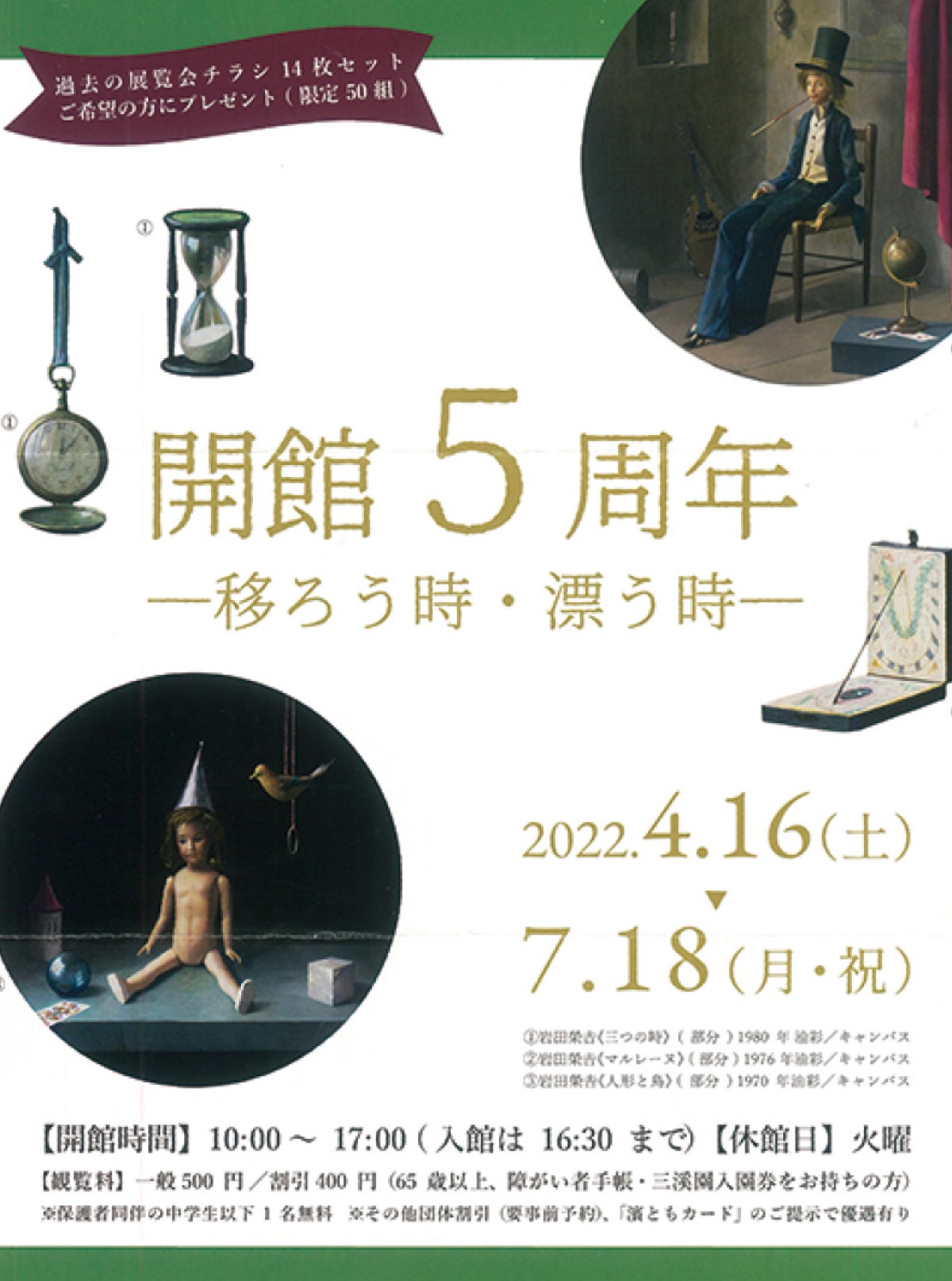 横浜本牧絵画館は、日本におけるトロンプルイユ(だまし絵)の第一人者・岩田榮吉の作品をメインコレクションとしており、今年は岩田の没後40年にもあたる。今企画展「開館5周年-移ろう時・漂う時-」では、岩田の作品などを展示。同絵画館は「これまでの展覧会を俯瞰すると、通底する大きなテーマはまさに『時』だったとも言える」と説明する。開館は午前10時〜午後5時。火曜休館、観覧は一般500円。(問)同絵画館【電話】045・629・1150
