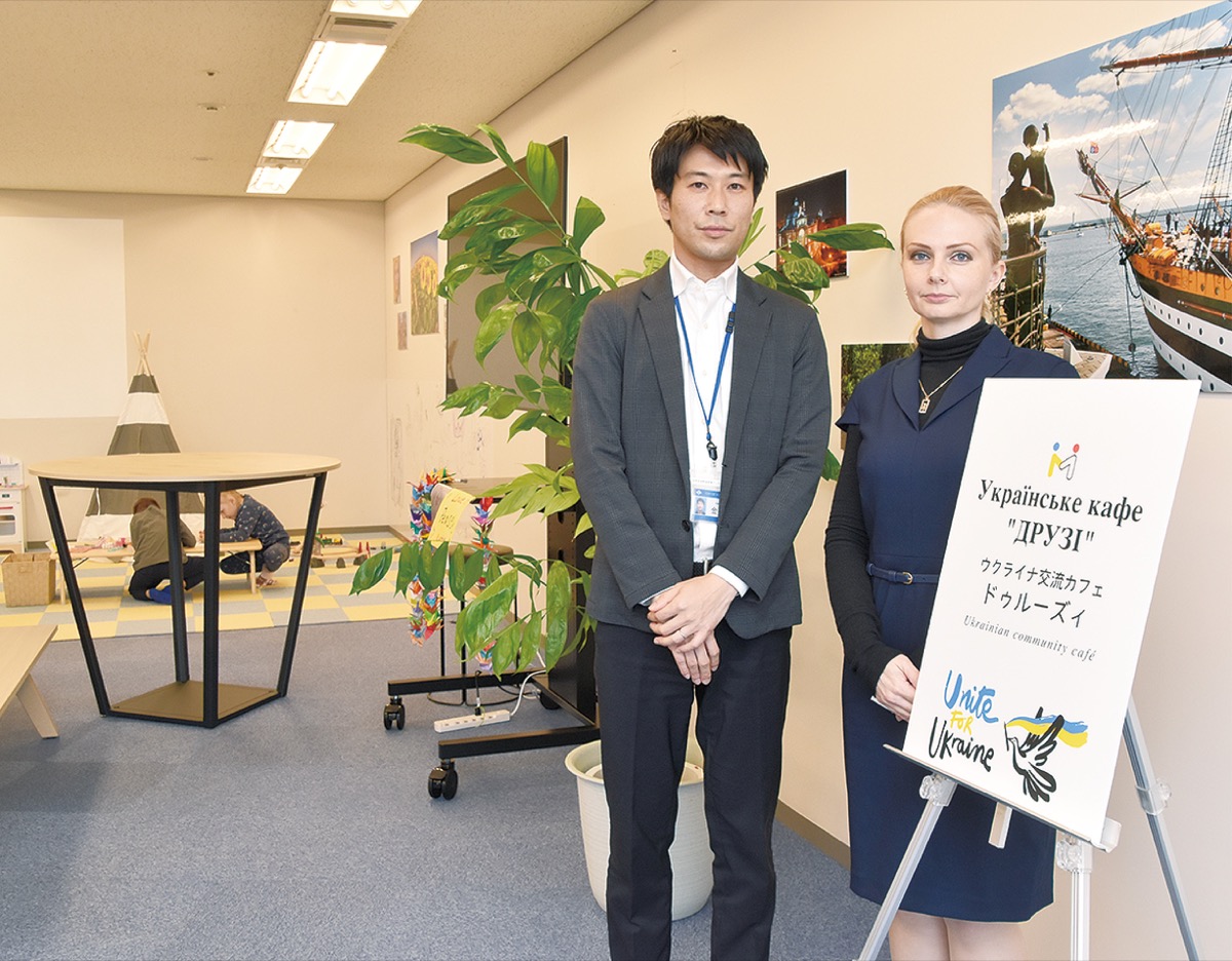 カフェの運営は、同センター内に拠点を持つ(公財)横浜市国際交流協会に委託。「ドゥルーズィ」という施設名は、「友達」という意味のウクライナ語から付けた。横浜に避難してきたウクライナ人たちが、母国語で話したり、情報交換できる場所を提供するほか、企業からの寄付やボランティアをつなぐ場としても活用していく。母子で避難してきた人も多いことから、カフェの中にはキッズスペースも設けられた。