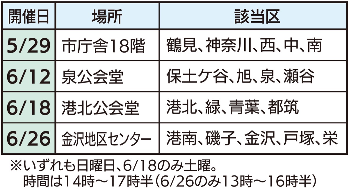 市内在住・在勤・在学者が対象で1回50人(事前申込制)。応募多数の場合、該当区の人を優先して抽選。参加申込はインターネットの入力フォーム、またはファクスで5月23日まで。(問)市港湾局山下ふ頭再開発調整課【電話】045・671・7314(平日午前8時45分〜午後5時15分)。