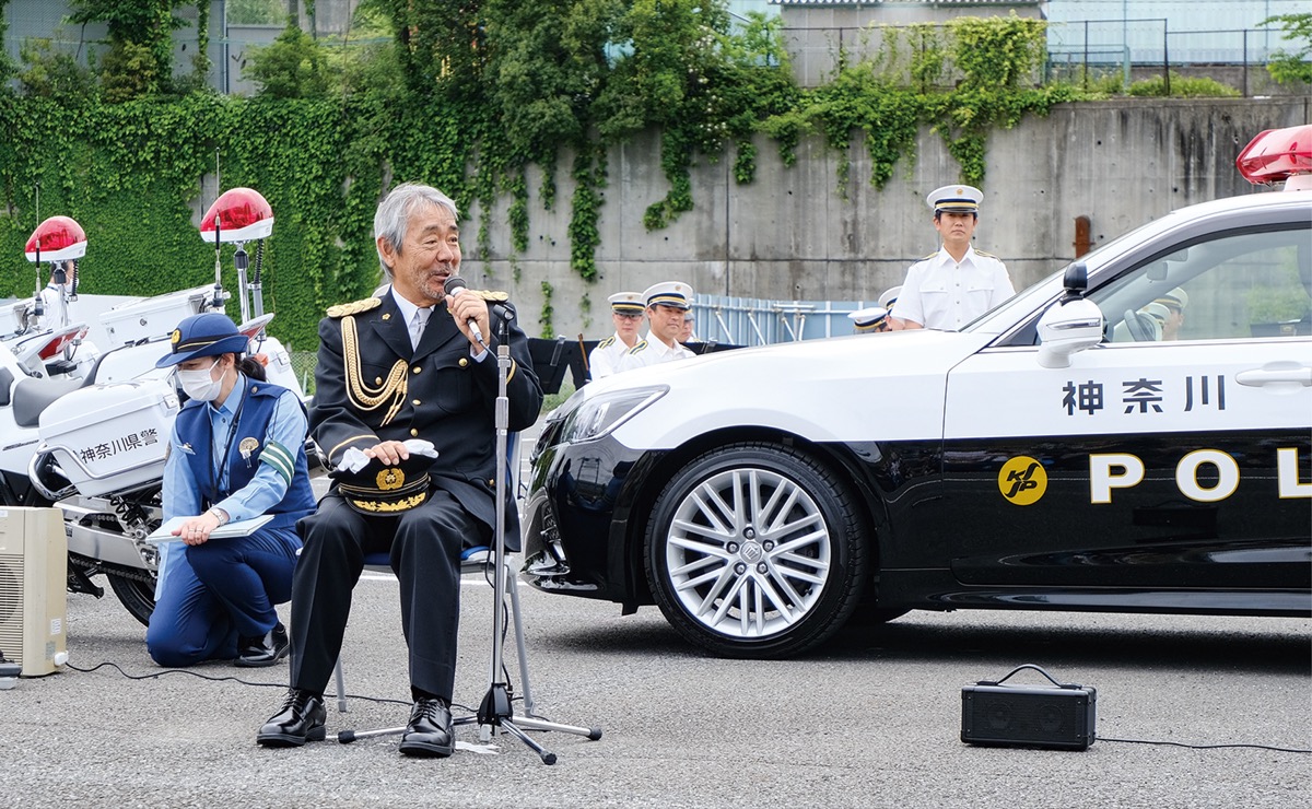 当日は、75歳以上の高齢運転者の他、近隣の学校の生徒がグラウンドなどから見物する姿も。たくさんの拍手の中、パトカーに乗車して登場した寺尾さん。トークショーでは「『信号が変わりそうだぞ』『了解』と一人でかけあえば、眠気も冷めます」と安全運転の秘訣などを語った。