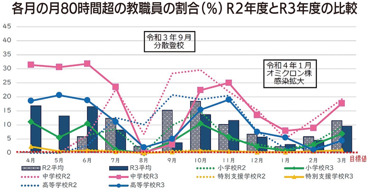 時間外在校等時間の状況を2018年と比較すると、月80時間超の教職員の割合は小学校で8・1%から5・1%、中学校で32・8%から18・0%と着実に減少したことが明らかになった。
