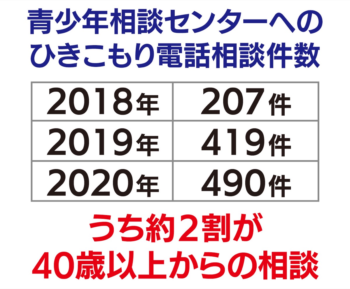 若年層だけでなくいわゆる「8050問題」など、中高年のひきこもりが社会問題となる中、市が2017年度に行った調査では、市内で40歳から64歳でひきこもり状態にある人は約1万2000人と推計されている。