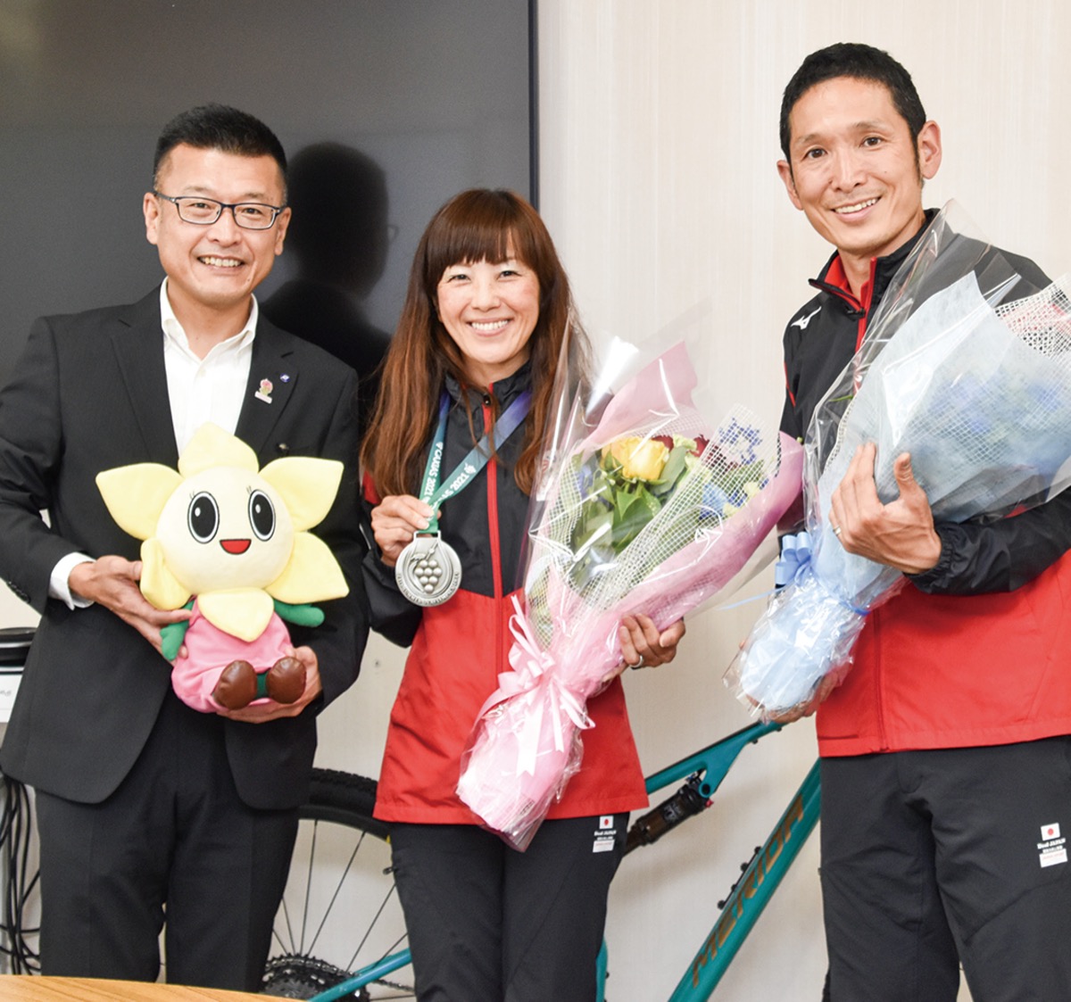 夫の憲太郎さんも自転車競技の3種目に出場。入賞はかなわなかったが、久美さんのチームメンバーとして、自転車のメンテナンスを担当するなど、サポートしてきた。久美さんは「チームメンバーの支えがあってこその結果」と話した。