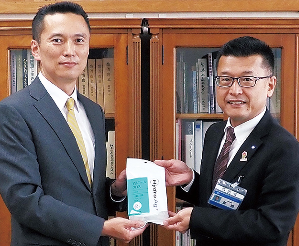 横浜ランドマークタワーに事務所を置く総合ビルメンテナンスの二幸産業(株)神奈川支社は、新型コロナウイルス感染症の拡大防止に役立ててもらおうと除菌クロスを西区役所に寄贈した。5月18日に同神奈川支社の舟木俊夫支社長が区役所を訪れ、菊地健次区長に除菌クロスを手渡した。