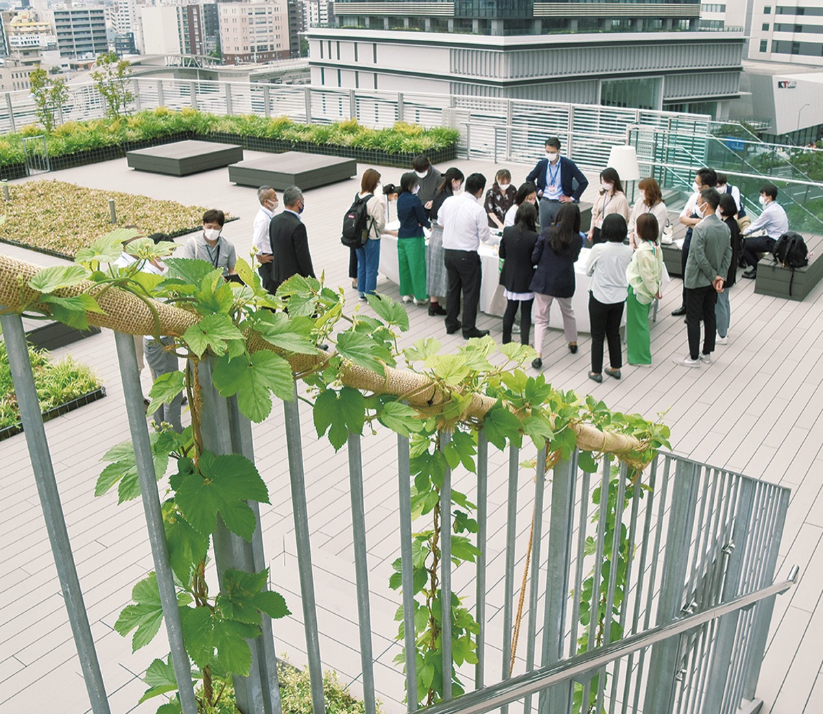 神奈川大学はビールの原料となるホップの栽培プロジェクトをスタートさせた。6月9日にはみなとみらい(MM)キャンパス6階のテラスでスタートアップイベントが開かれ、学生や職員、9つの企業や団体の関係者ら、約30人が参加した。