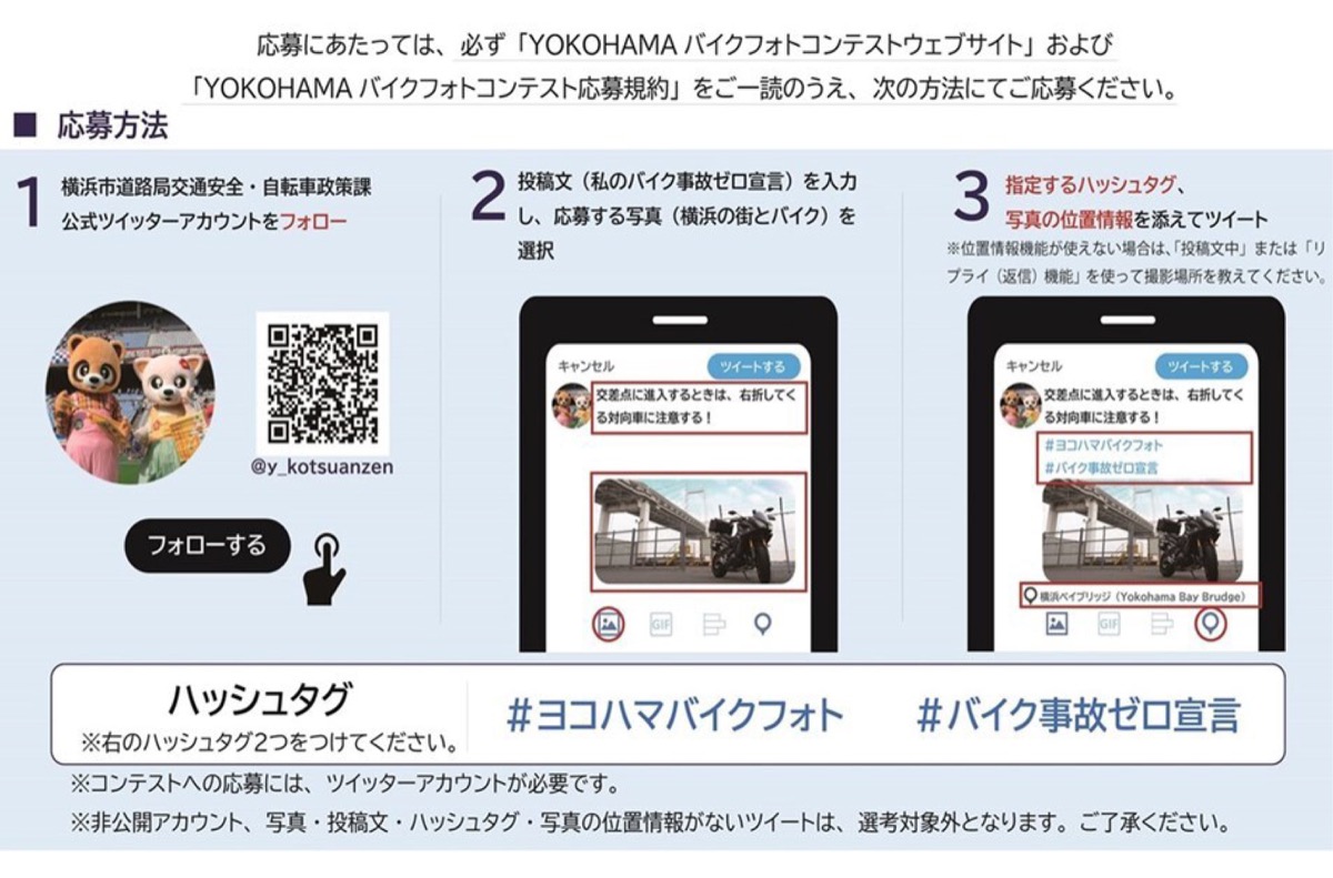 応募方法は市道路局交通安全・自転車政策課のツイッターアカウント(@y_kotsuanzen)をフォロー。募集テーマに沿った写真と投稿文にハッシュタグ「#ヨコハマバイクフォト」「#バイク事故ゼロ宣言」を付けて投稿。また写真の撮影位置情報を添えてツイートする=写真参照。