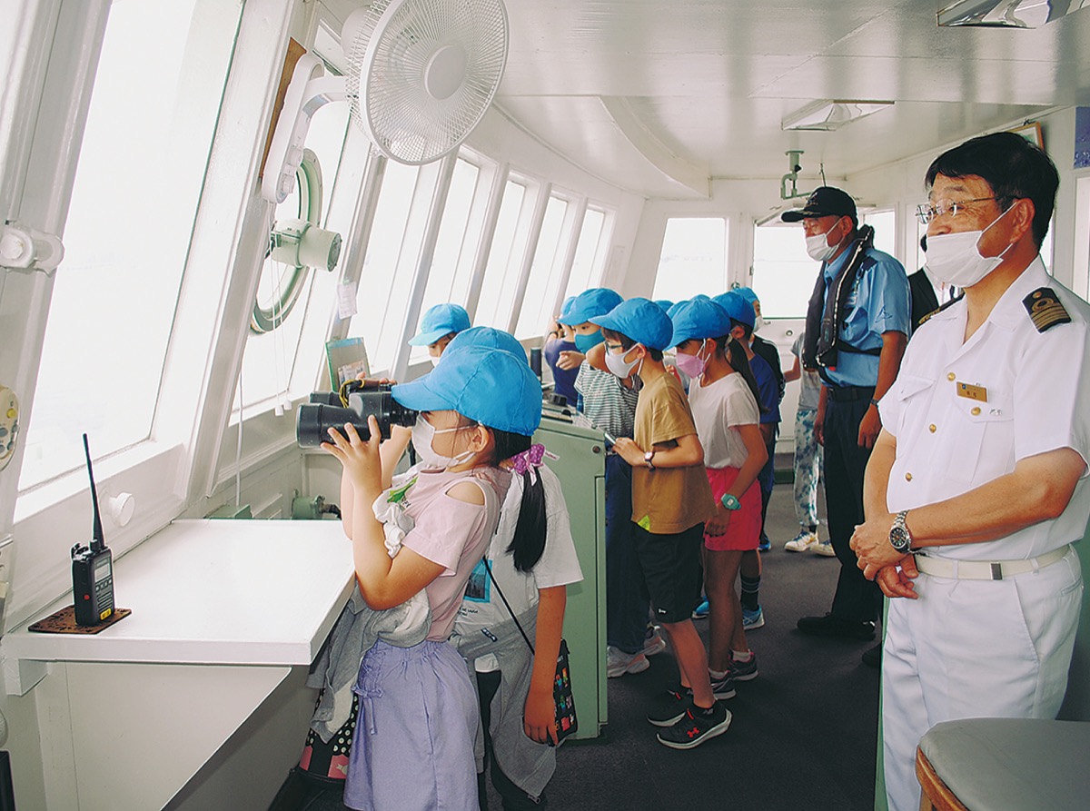 船内では操舵室の見学や、(一社)横浜港振興協会の今村裕一郎専務理事が横浜港について紹介。横浜港に入ってくる船の数が1日約100隻と聞くと、子どもたちは「知らなかった」と驚いた様子だった。