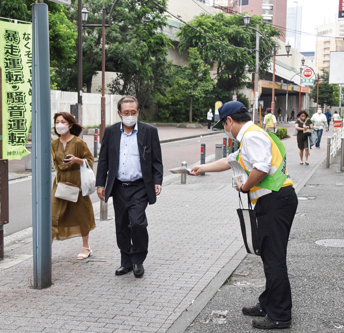 二輪車交通事故防止対策および暴走族追放強化月間にともない、JR石川町駅北口前の歩道で交通事故防止の啓発チラシ配布が行われた。伊勢佐木警察署交通課および県警本部の交通捜査課暴走族対策室、同署管内の交通安全協会、交通安全推進委員が参加した。
