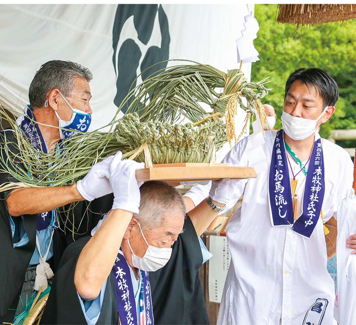 457回を数えるお馬流し。境内で育てられた茅で作った6体のお馬さまは、8月6日に境内に迎えられ、7日は「送り式」の後に、本牧地域の18カ町を巡り本牧漁港から船に載せられ海上へ。