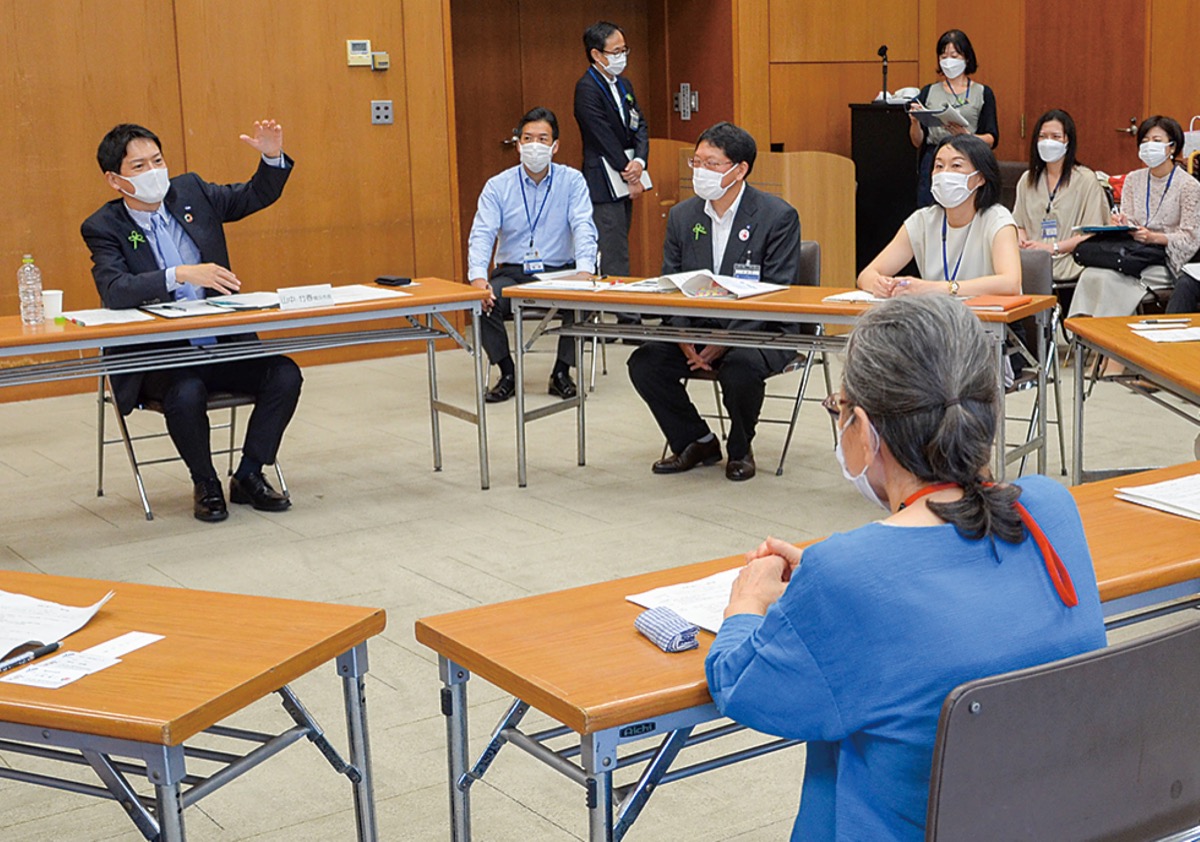 市内18区を山中竹春市長が訪問し、市民と子育てをテーマに対話する「市長と語ろう」の第9弾が7月7日、中区役所で行われた。中区の「こんにちは赤ちゃん事業」の訪問員7人が参加。子育て家庭の現状を市長に伝えた。