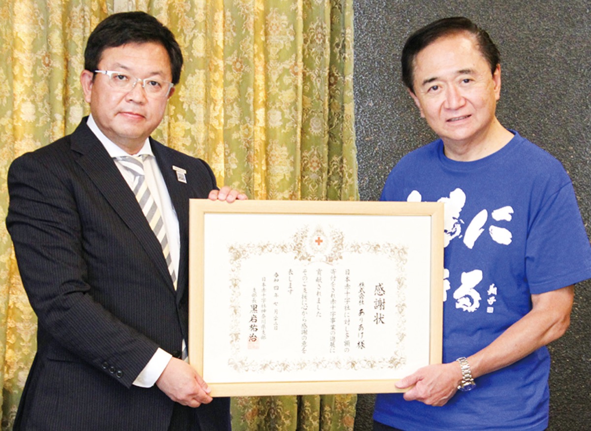 22日に県庁で感謝状を受け取った堀越社長は「『まずはできることを』との思いで寄付を行った。予想以上の反響だった」と話した。