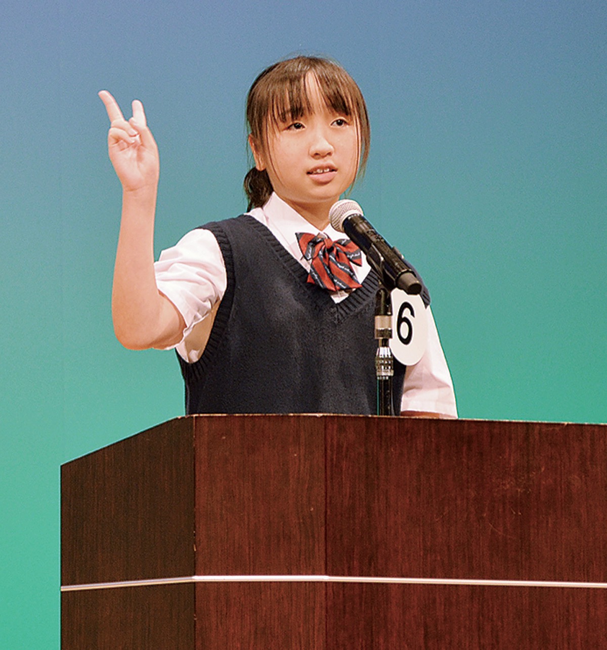 生徒会長を務めているため「みんなの前で話すのは慣れている」と笑顔で話す。身振り手振りも入れながら、堂々のスピーチで発表した。「私も成長するにつれ、自然のためにできる事が増えていくといいな」と思いを込めた。