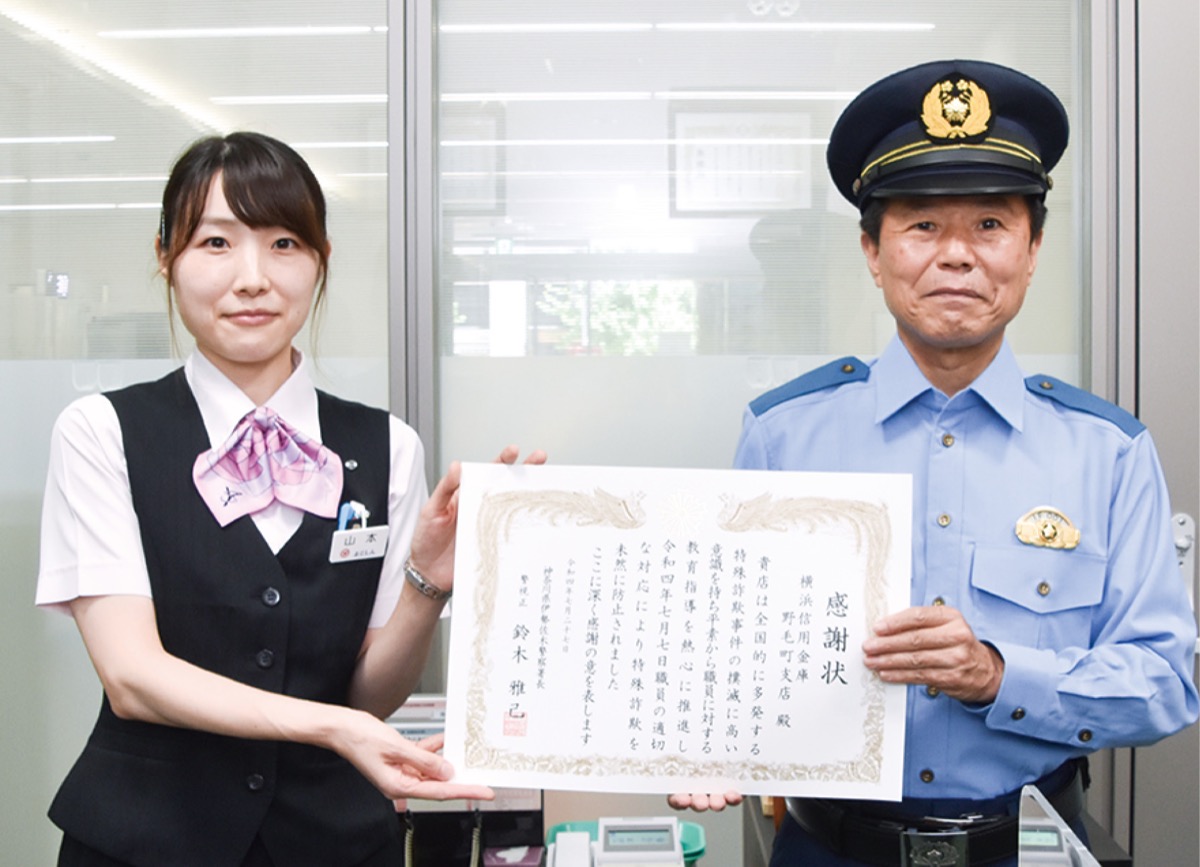 横浜信用金庫野毛町支店のお客様サービス課、山本ゆりなさんが、来店者を詐欺被害から未然に防いだとして7月27日、伊勢佐木警察署の鈴木雅己署長かた感謝状を贈呈された。