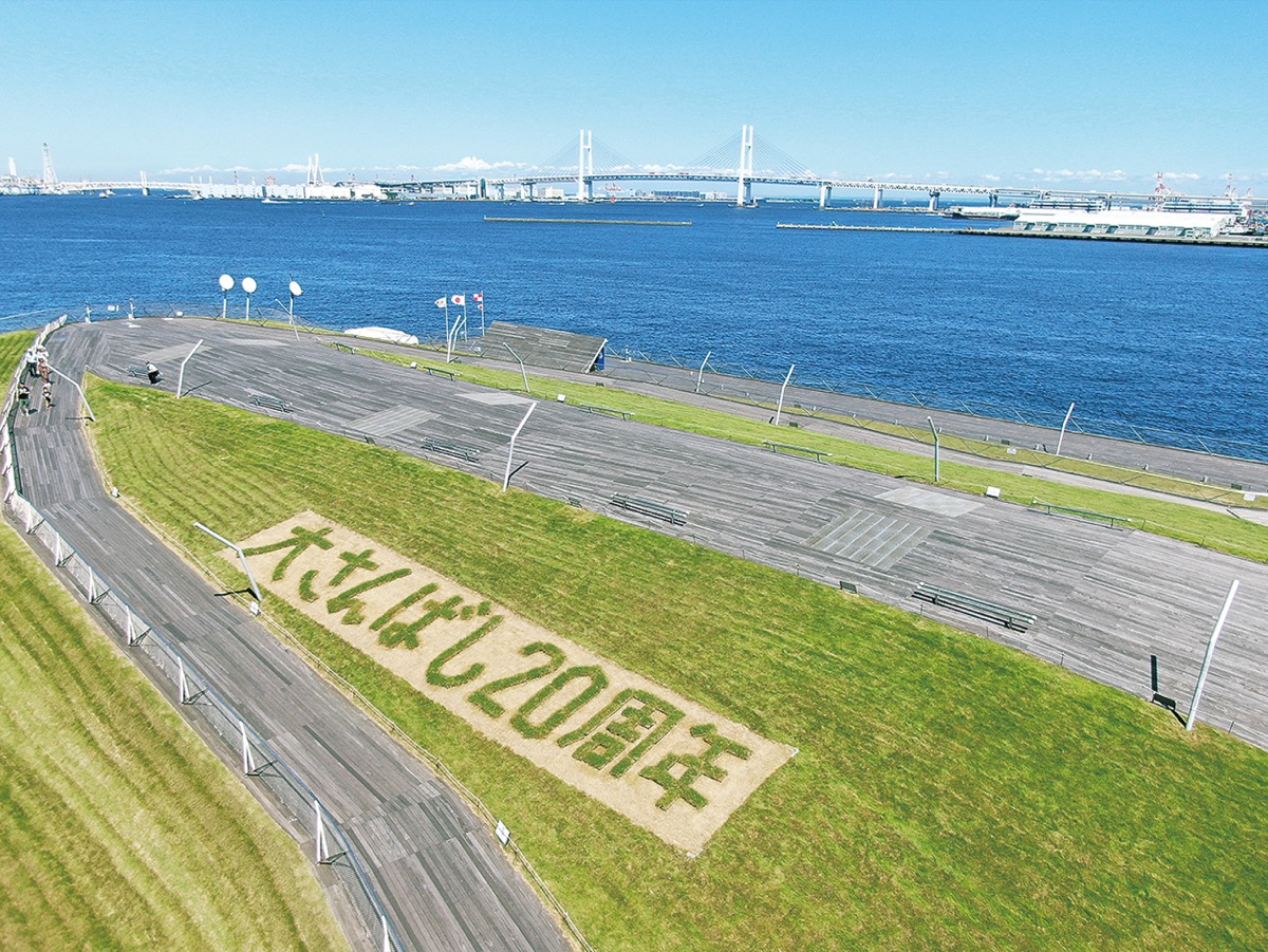 横浜港大さん橋に全長20mにおよぶ芝生に描かれたメッセージが出現した。ターミナルのリニューアル20周年を記念したもので、8月31日まで見ることができる。
