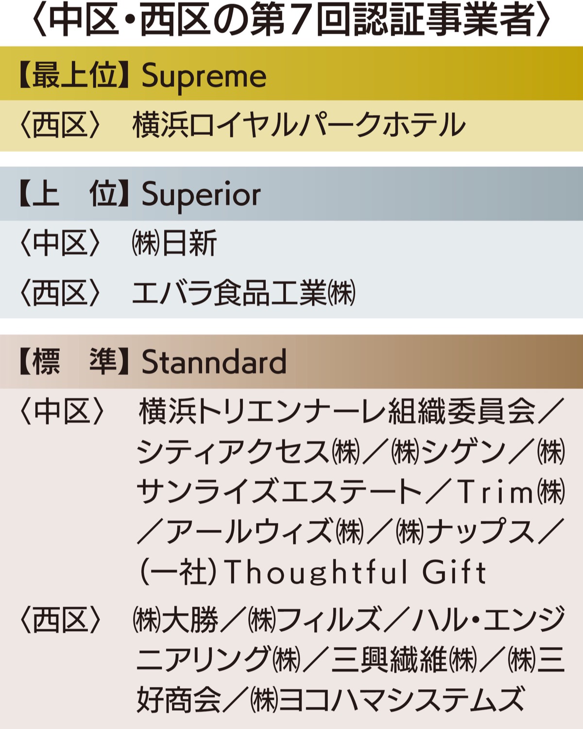 ランク別では、中区と西区から最上位に横浜ロイヤルパークホテルがランクアップ。上位には(株)日新とエバラ食品工業(株)が認証を取得(いずれも新規)。